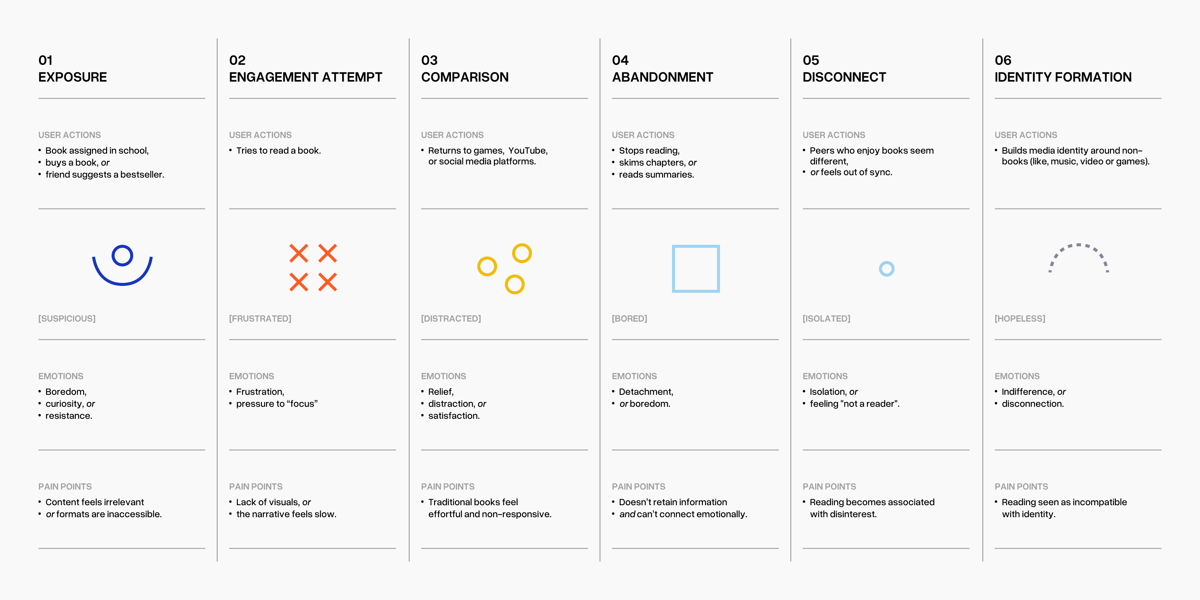 Informed by our user interviews, we mapped the journey of younger audiences from initial exposure to reading to the eventual formation of a 'non-reader' identity.